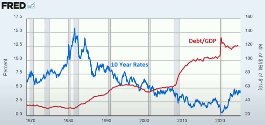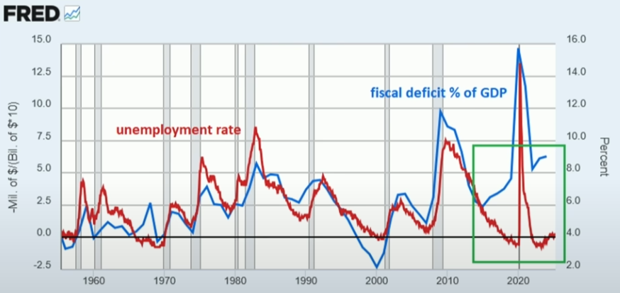这张图表显示了两条线,一条是失业率,一条是联邦赤字占GDP的百分比,长久以来。它们之间一直存在着很好的相关性。在经济衰退期间,失业率联邦赤字也会上升。在经济状况较好的时候,失业率很低,联邦赤字也很低。唯一的例外是 1960 年代,那时发生了越南战争。除此之外,这些几乎是同一条线。