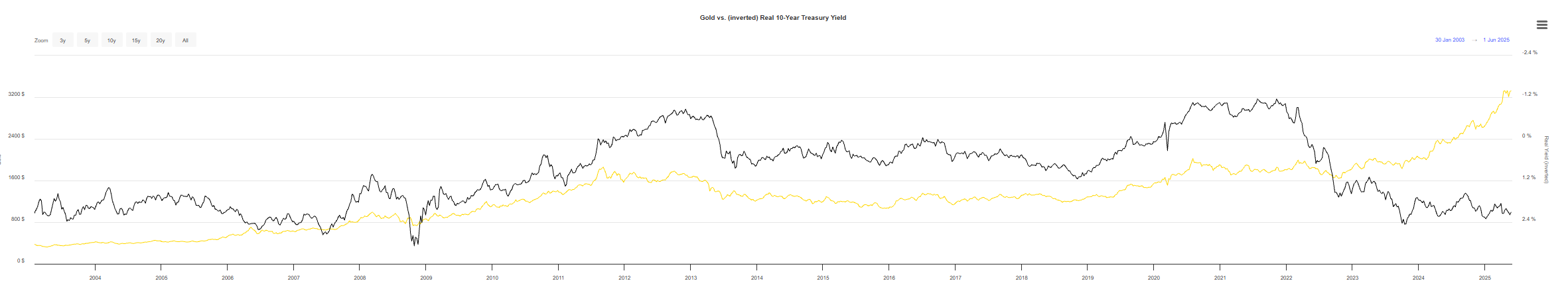 而在这张图表上,实际利率是倒置的,正如你在过去几年中所看到的,特别是从 2022 年左右开始,黄金价格和实际利率已经完全脱钩,在这种财政主导的环境中,一些新的事情正在发生。