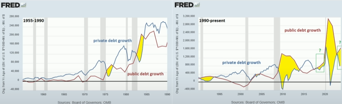 图表上的蓝线是私营部门的年度债务增长率,也就是银行贷款和公司债券之类的,红线是联邦债务增长率,如果你看左图,大部分蓝线表示私营部门债务的增长速度在任何一年都比公共部门债务的增长速度快。在经济衰退期间也有一些例外,图表上用黄色标记了这些例外。因为在经济衰退期间,赤字会增加,银行贷款会减少。